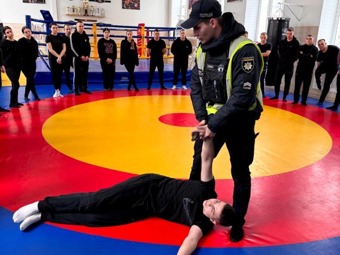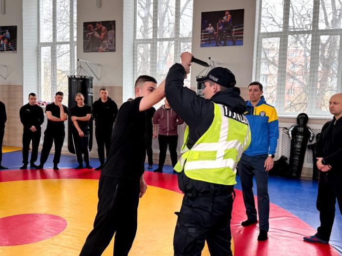 Під час практичного заходу курсанти відпрацьовували прийоми захисту від ударів ножем, знешкодження та затримання озброєного правопорушника шляхом нанесення контрударів в озброєну кінцівку та уразливі точки тіла. Вони також опанували техніки обеззброєння і затримання з використанням кидків, больових прийомів та елементів комбінованого захисту.