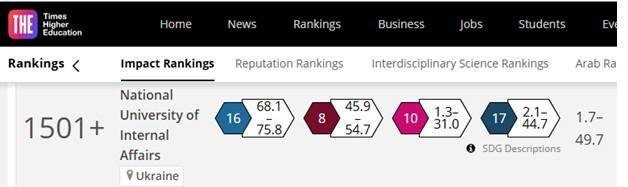 Kharkiv National University of Internal Affairs is the only one among the higher education institutions of the Ministry of Internal Affairs of Ukraine, which is represented in the international ranking THE Impact Rankings 2025. This year, it took place in the group 1501+.