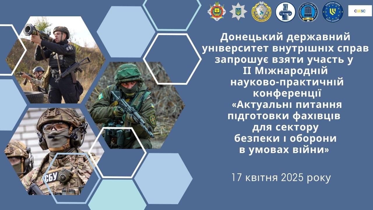 17 квітня 2025 року Донецький державний університет внутрішніх справ спільно з Національним університетом імені Ярослава Мудрого, Запорізьким національним університетом, Університетом митної справи та фінансів, Консультативною місією Європейського Союзу та Центром українсько-європейського наукового співробітництва проводить ІІ МІЖНАРОДНУ НАУКОВО-ПРАКТИЧНУ КОНФЕРЕНЦІЮ «АКТУАЛЬНІ ПИТАННЯ ПІДГОТОВКИ ФАХІВЦІВ ДЛЯ СЕКТОРУ БЕЗПЕКИ І ОБОРОНИ В УМОВАХ ВІЙНИ»