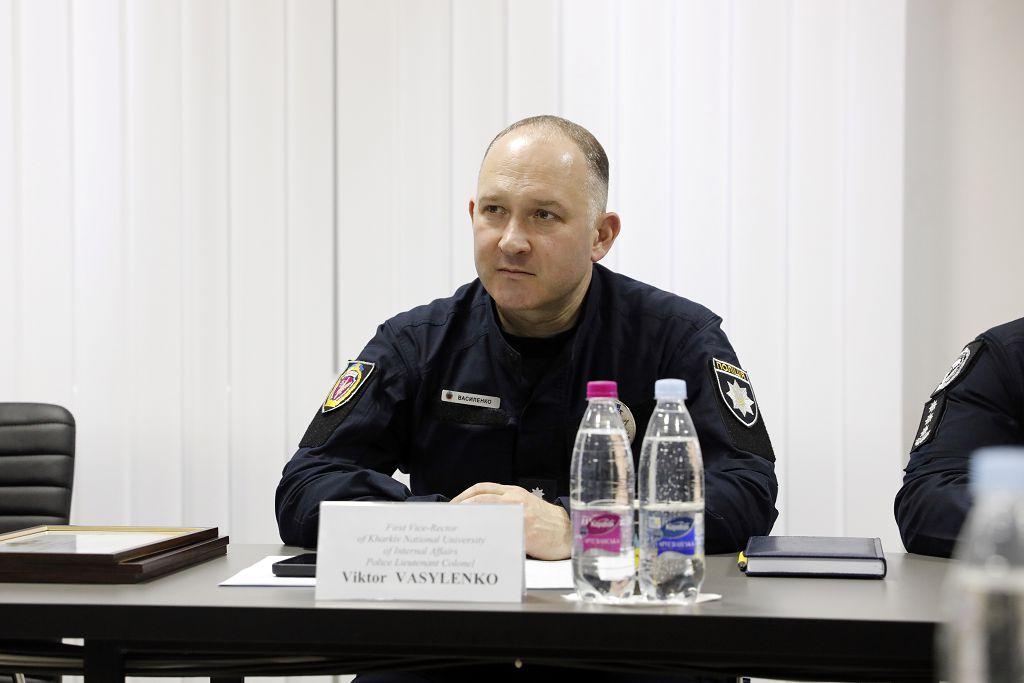Viktor VASYLENKO welcomed the guests on behalf of the university rector, Valerii Sokurenko. He emphasized the importance of cooperation with European partners and stressed that the joint work of Kharkiv National University of Internal Affairs and EUAM in Ukraine is long-term and effective. “Last year alone, more than 150 representatives of the university took part in events with the participation of EUAM Ukraine and received certificates. We will continue to develop our partnership, because high-quality training of Ukrainian law enforcement officers is a guarantee of security and stability of our country,” said the First Vice-Rector. He emphasized the readiness of the academic staff and students of Kharkiv National University of Internal Affairs to share their knowledge and experience with police officers from European countries and called on European partners to expand cooperation in this area.