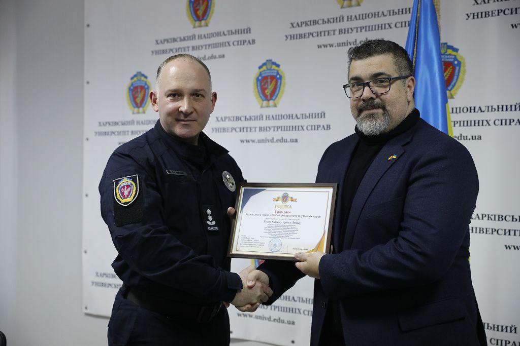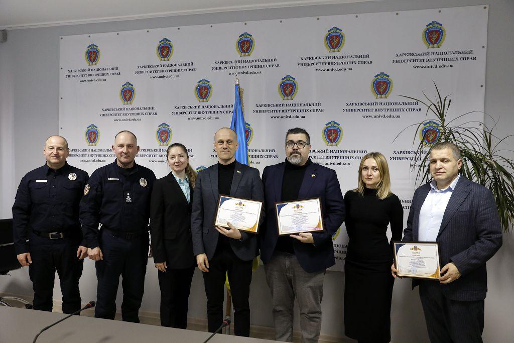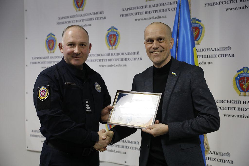 Noting the significant contribution of foreign partners to the training of law enforcement personnel of Ukraine, high professionalism, personal initiative and creative approach to the training course, the First Vice-Rector presented the Acknowledgement of the Academic Council of KhNUIA to senior OSINT advisers Juan Carlos ADRIANS LOPEZ and Theo MANDOCCA, as well as to criminal investigation expert Vasyl BODNARIUK.