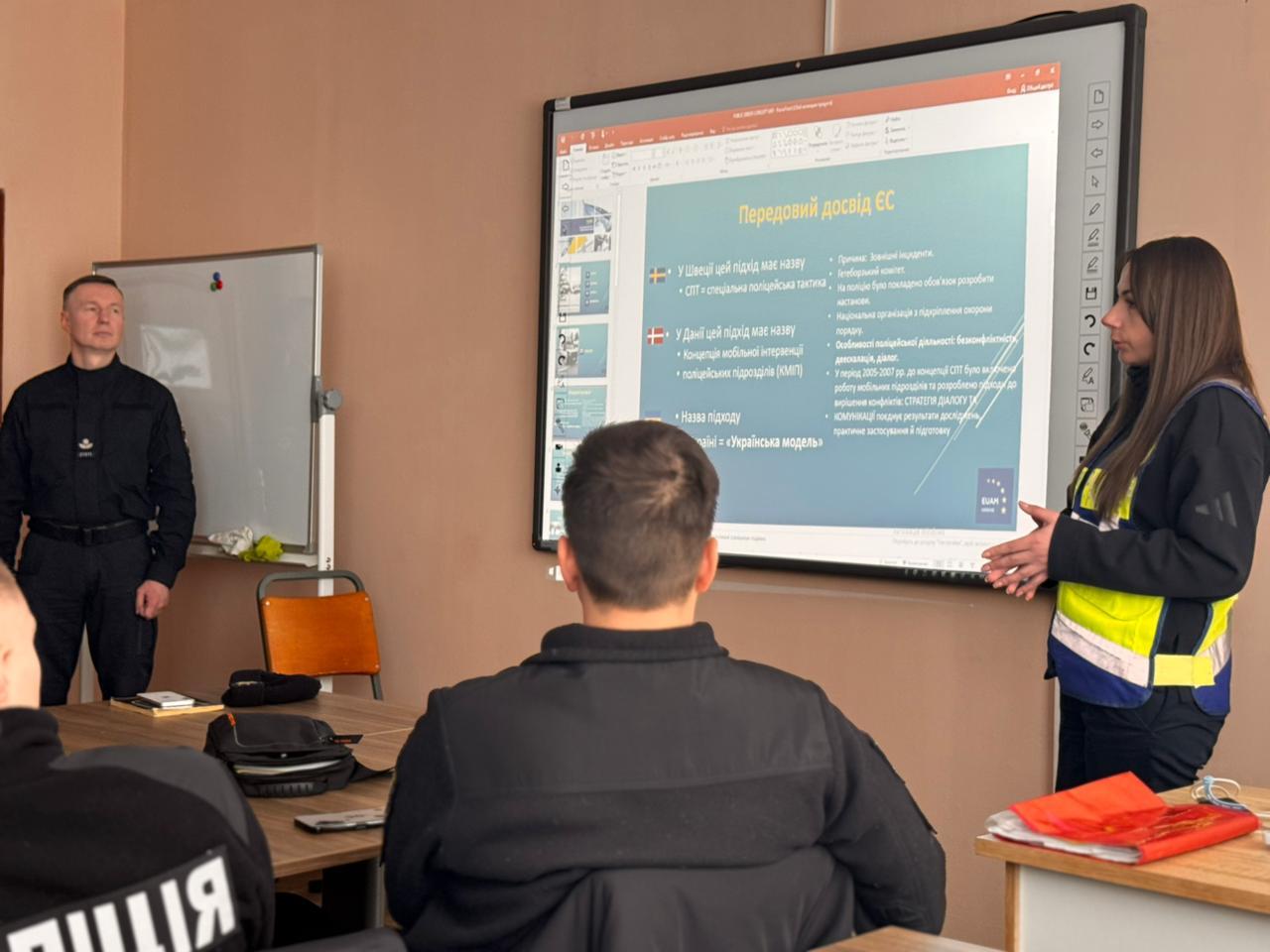 Під час теоретичної частини заняття курсанти ознайомилися з основними принципами скандинавської моделі поліцейської діяльності, що передбачає пріоритет комунікації, попередження конфліктів та їх деескалацію шляхом налагодження конструктивного діалогу з громадянами. Обговорили роль поліцейського як комунікатора та посередника в урегулюванні потенційно конфліктних ситуацій.