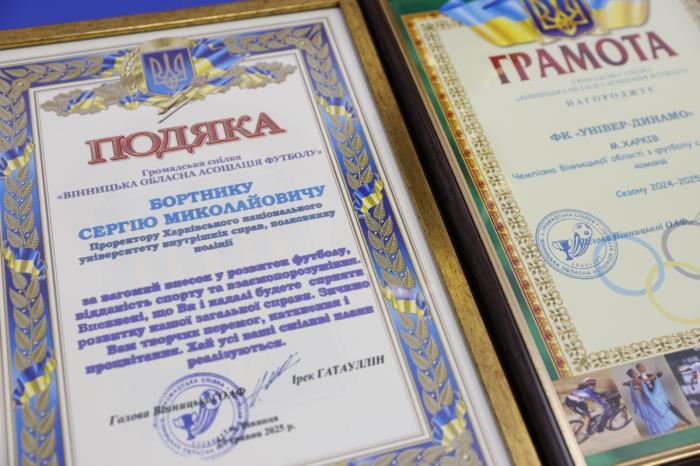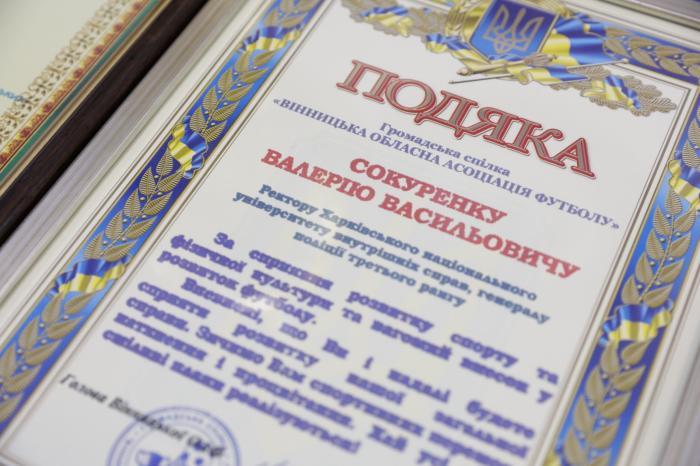 For their significant contribution to the development of football, dedication to sports and mutual understanding, the rector, Valerii SOKURENKO, and the vice-rector, chairman of the board of FGC "Univer-Dynamo" Serhii BORTNYK received Gratitude from Vinnytsia Regional Football Association, a soccer ball and sports uniforms for the team players.