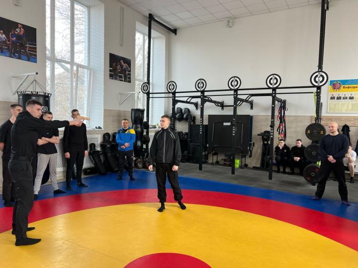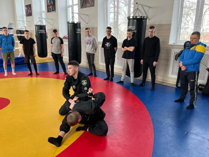 Head of the Department of Special Physical Training of the ERI No. 2 Bohdan LUKIN, senior lecturer of the same department Mykhailo INSHEKOV and police officer of the platoon of the 1st company of Kamianets-Podilskyi district of the Patrol Police Department of Khmelnytskyi region of the Patrol Police Department Yevhen PAZIUK held a lesson with cadets of the ERI No. 4 on the topic "Improving the technique of defense against the attacking actions of an armed offender".