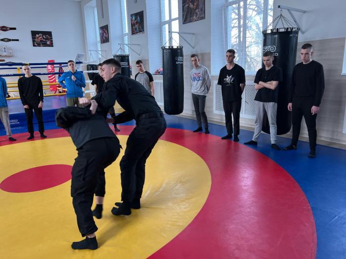 They examined the technique of disarming and detaining an offender using throws, painful and suffocating techniques, a rubber baton and combined defense. The cadets also practiced defense against the attack of an offender armed with a pistol and his detention.