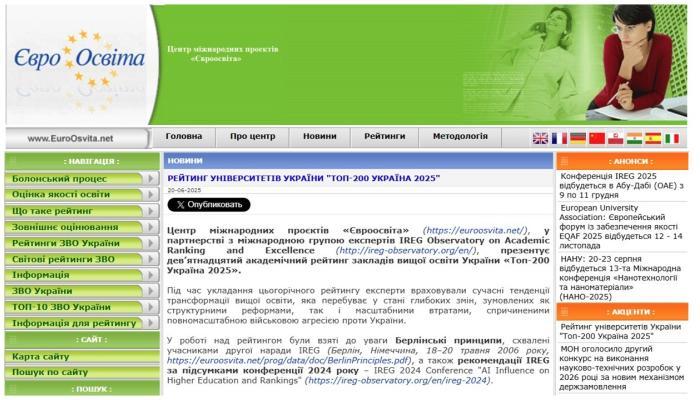 The Center for International Projects "Euroosvita" (https://euroosvita.net/) in partnership with the international expert group IREG Observatory on Academic Ranking and Excellence (http://ireg-observatory.org/en/) presented the eighteenth academic ranking of higher education institutions of Ukraine "Top-200 Ukraine 2025".