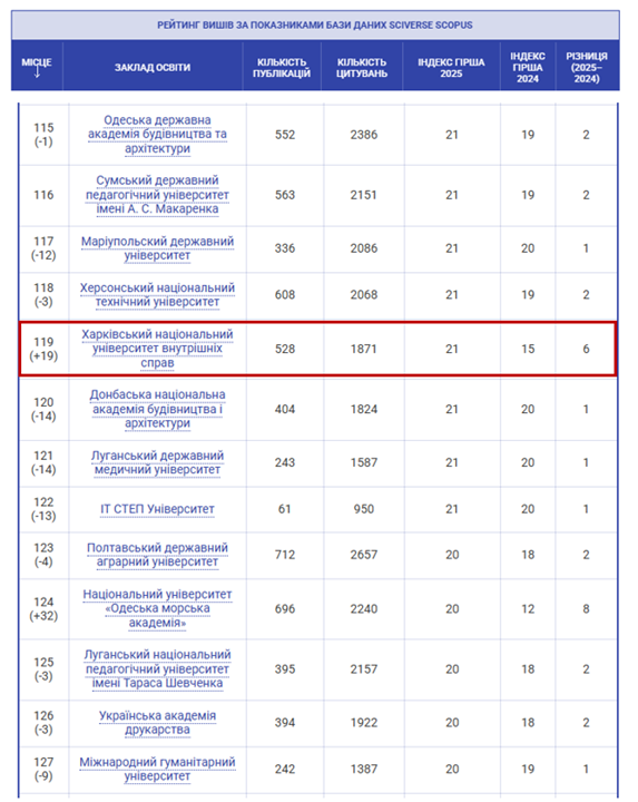 Having risen 19 places, Kharkiv National University of Internal Affairs took 119th place. Currently, the university's Hirsch index is 21. This is the best result among higher education institutions of the Ministry of Internal Affairs that train police officers.