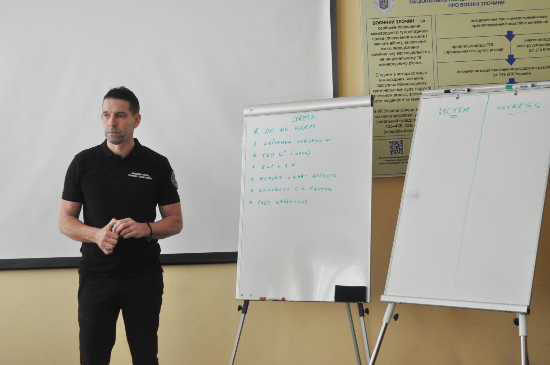 The practical session on interviewing victims and witnesses was conducted by Senior Advisors on Investigation of International Crimes Vincent HAUGHNEY and Gary CORRIGAN. At the beginning, they focused on the specifics of preparing for an interview, the key points on which police officers should focus, and the rules they should follow to conduct an interview effectively. The audience’s attention was focused on the PEACE cognitive interview method. After familiarizing themselves with the main components of the method, EUAM experts demonstrated a video of a war crime, divided the group into subgroups, and assigned each subgroup a task – to develop and present an interview program from the perspective of eyewitnesses and other witnesses. Based on the results of the presented reports, a discussion was held, during which the participants agreed that the quality and completeness of the information collected during the interview directly depends on its preparation and conduct.
