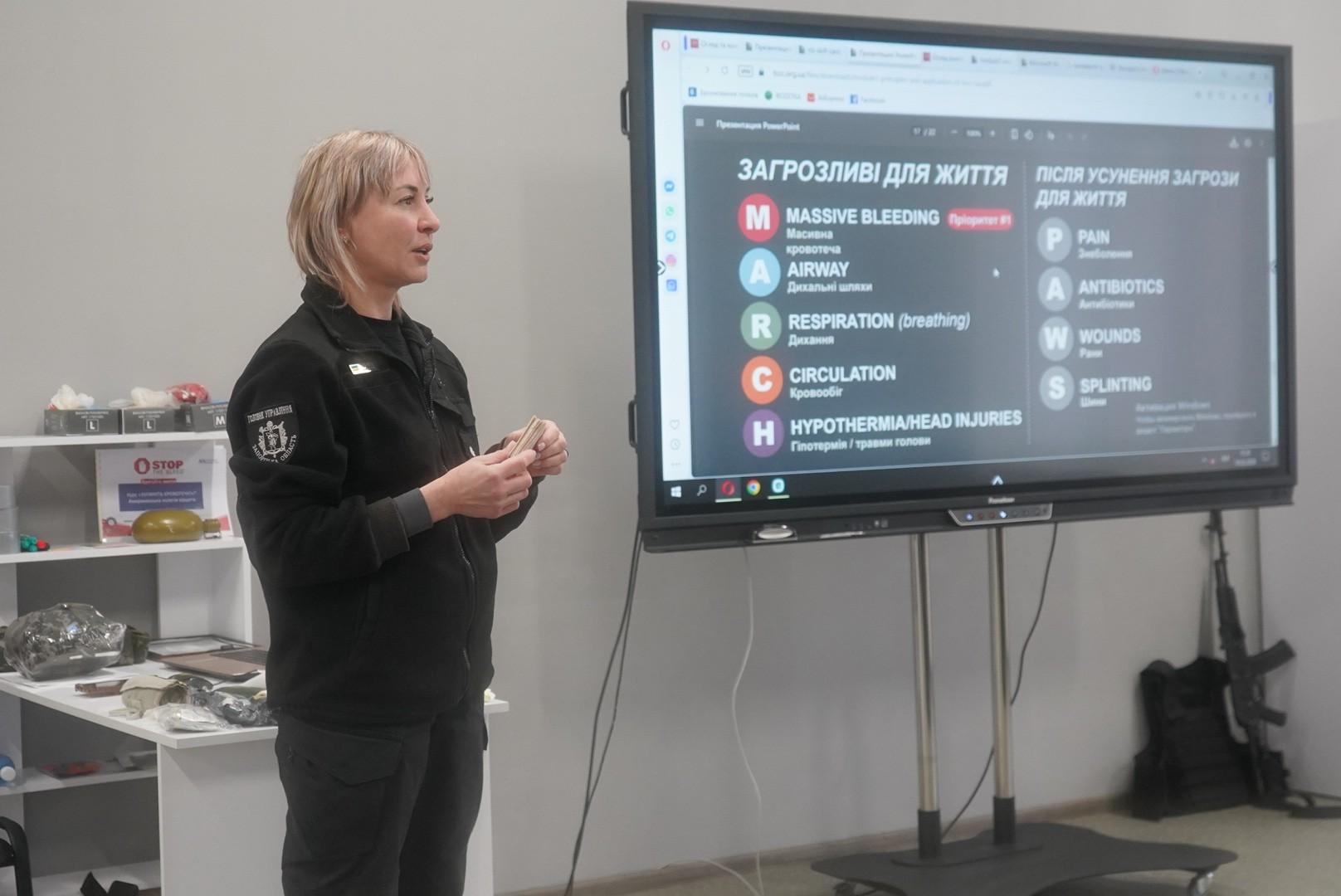 During the next tactical medicine class, Luhansk region police officers practiced the algorithm for stopping massive hemorrhages according to the MARCH protocol (Massive hemorrhage, Airway, Respirations, Circulation, Head injury/Hypothermia).