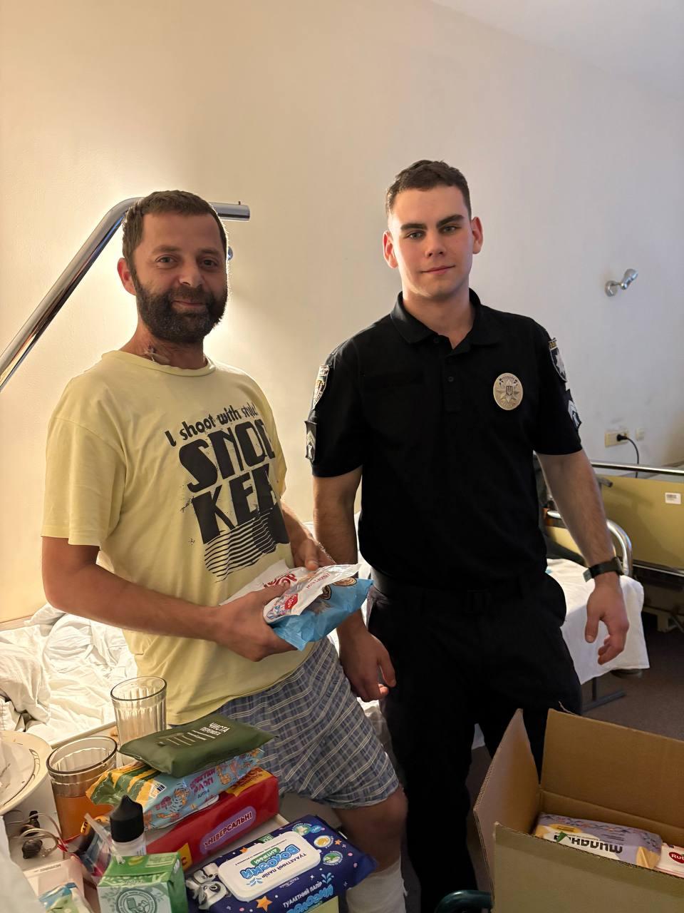 Від імені курсантського самоврядування НАВС до госпіталю завітали заступник голови Парламенту курсантського (студентського) самоврядування капрал поліції Тимур Меджидов та головний секретар Парламенту капрал поліції Наталія Єременко. Вони передали зібрану допомогу представникам госпіталю та висловили вдячність медикам за їхню самовіддану працю.