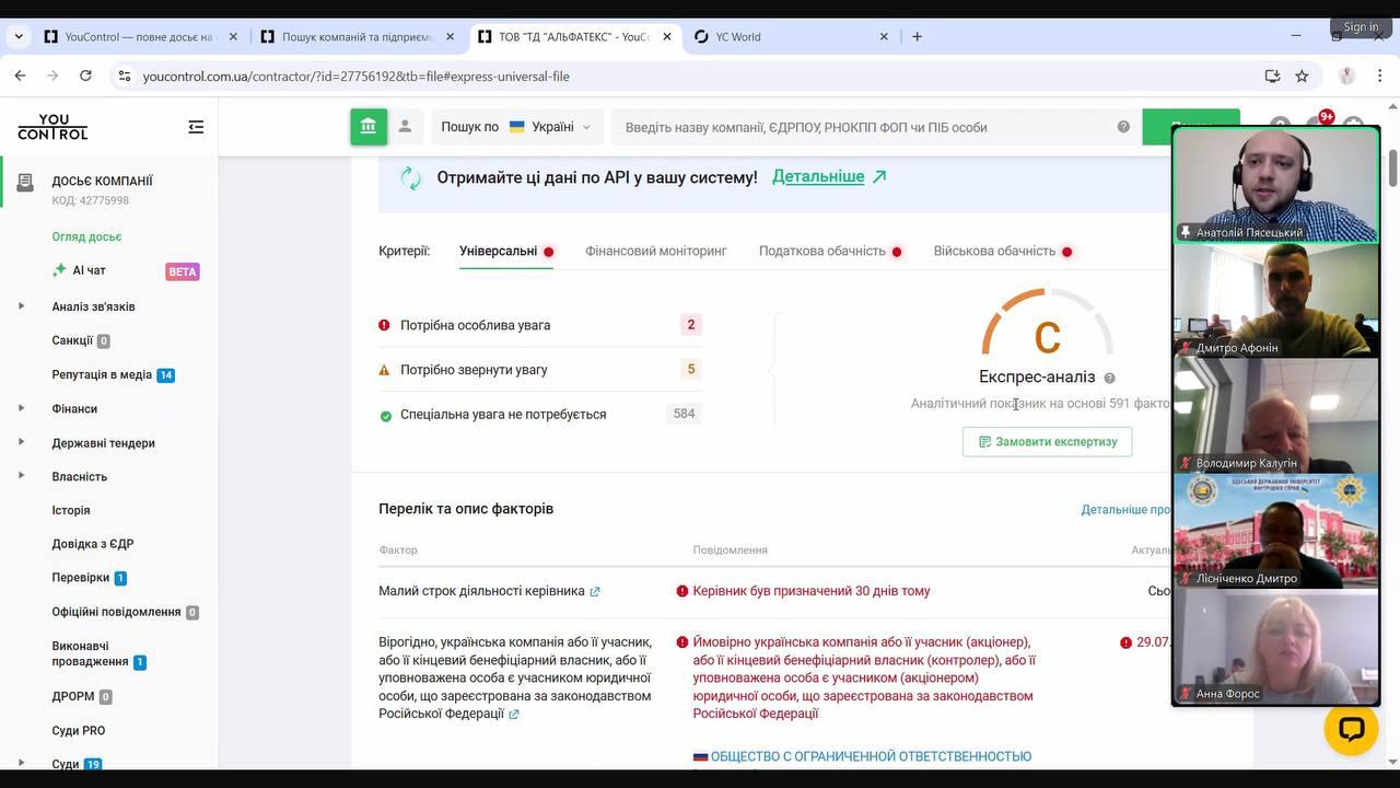 In a video conference, YouControl Academy's leading trainer Anatolii Pyasetskyi familiarized employees of the Criminal Analysis Research Laboratory, the Department of Criminal Analysis and Information Technology, as well as cadets and students of the cyber group with algorithms for checking individuals and legal entities using the powerful YouControl system.