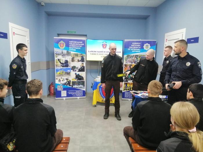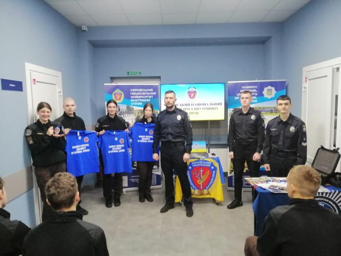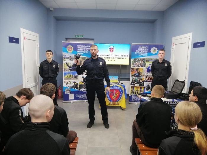 Kharkiv National University of Internal Affairs continues its active campaign on professional guidance. Deputy Director for Educational and Research Work of Kharkiv National University of Internal Affairs Yurii Onyshchenko, as well as cadets Denys Kuliush and Oleksandr Lohunov visited the pupils of Dnipro Lyceum of Security and National and Patriotic Education named after Oleksandr Hostischev of Dnipro State University of Internal Affairs.