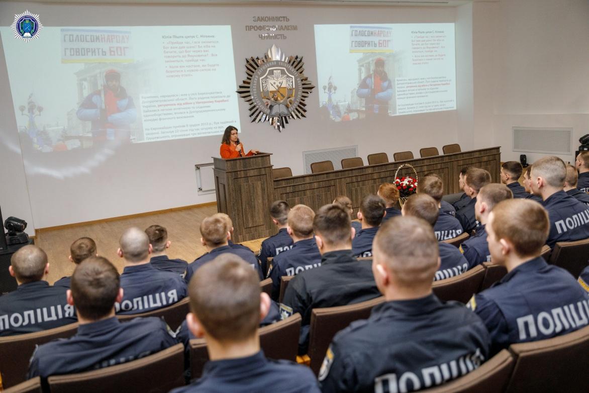 Special attention was given to the tragic events of February 2014, when protesters were killed in mass shootings on Maidan—victims later known as the Heavenly Hundred. The cadets also watched a video presentation related to the topic.