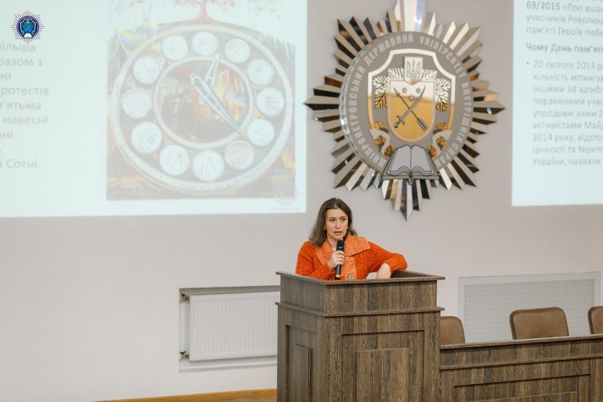 The cadets were visited by Iryna REVA, a researcher from the Dmytro Yavornytskyi Dnipropetrovsk National Historical Museum. She delivered a lecture on the events of the Revolution of Dignity that took place in early 2014 in Ukraine. The lecturer emphasized the significant contribution of the residents of the Dnipropetrovsk region to the national resistance, which helped affirm the country’s European course of development.