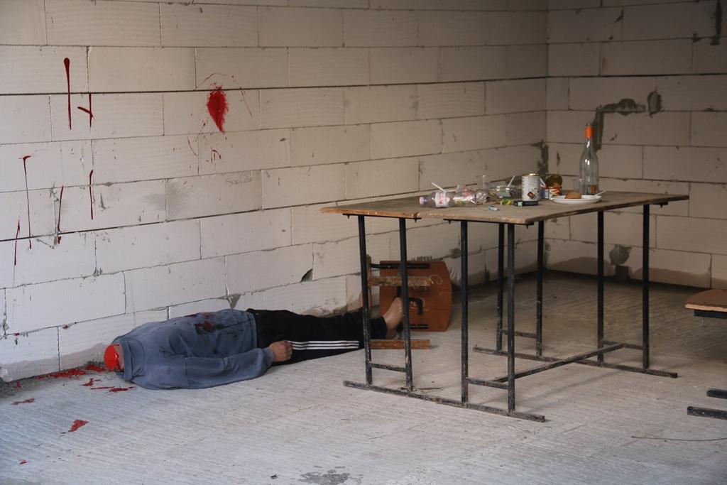 1.The "Crime Scene Search" location was an unfinished building, where the following picture of the murder was reproduced on the ground floor: a body with many knife wounds and a severed head, a knife hidden, several fire holes in the wall, food and alcohol. Task: seach the scene and give investigative versions.