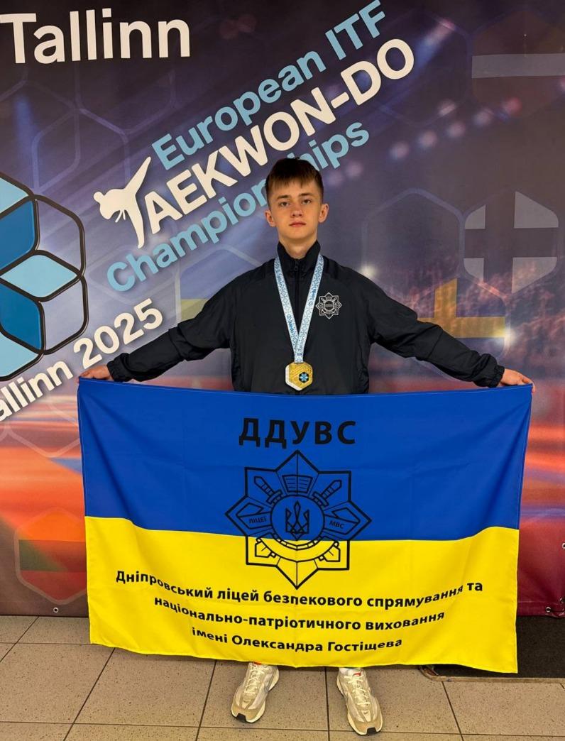 The European Taekwondo ITF Championship for juniors and adults concluded recently in Tallinn, Estonia, gathering talented athletes from across Europe at the Tallinn University sports complex. Levon Grigoryan, a student of the Dnipro Security-Oriented and National-Patriotic Education Lyceum named after O. Hostishchev at Dnipro State University of Internal Affairs (DSUIA), emerged as a true star of the event. In the tul (formal patterns) discipline among juniors aged 14–15, he showcased impressive technique, strength, and endurance, clinching first place and earning Ukraine a gold medal. This victory highlights the high level of training among DSUIA lyceum students and their readiness to represent Ukraine with distinction on the international stage.
