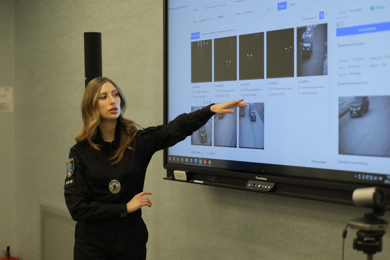 Lecturer from the Department of Administrative Law and Procedure, Police Senior Lieutenant Khrystyna Derevianko, presented practical case studies from police service. Using video materials, she analyzed and classified violations together with the cadets, showing how the "Safe City" system can be utilized by National Police officers in operational and investigative activities.