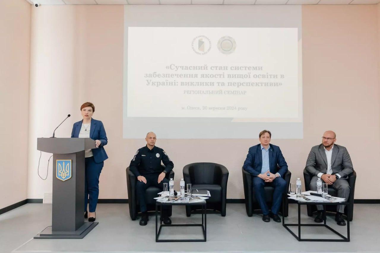 This was emphasized by the State Secretary of the Ministry of Internal Affairs Inna Yashchuk at the regional seminar of the National Agency for Higher Education Quality Assurance "Current State of the Higher Education Quality Assurance System in Ukraine: Challenges and Prospects”, which took place at the Odesa State University of Internal Affairs. The participants of the event had the opportunity to hear the explanations of the National Agency for Higher Education Quality Assurance on the new Regulation on Accreditation of Educational Programs, which is extremely relevant on the eve of the accreditation cycle of educational programs.