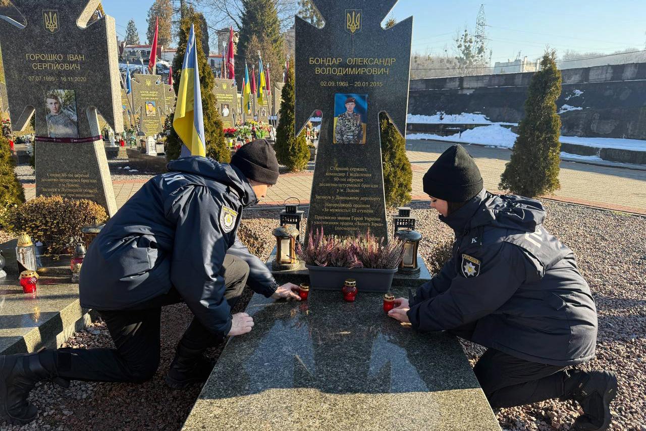 Юнаки та дівчата запалили лампадки й поклали квіти до могили «кіборга», військовослужбовця Збройних Сил України, львів’янина Олександра Бондаря на Алеї Героїв Личаківського військового цвинтаря.