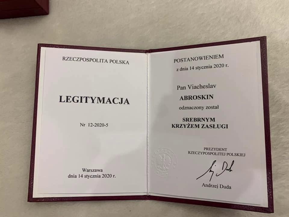 On March 26, Ambassador Extraordinary and Plenipotentiary of the Republic of Poland to Ukraine Bartosh Tsichotski aworded the "Silver Cross of Merit of the Republic of Poland" the Rector of Odessa State University of Internal Affairs Vyacheslav Abroskin.