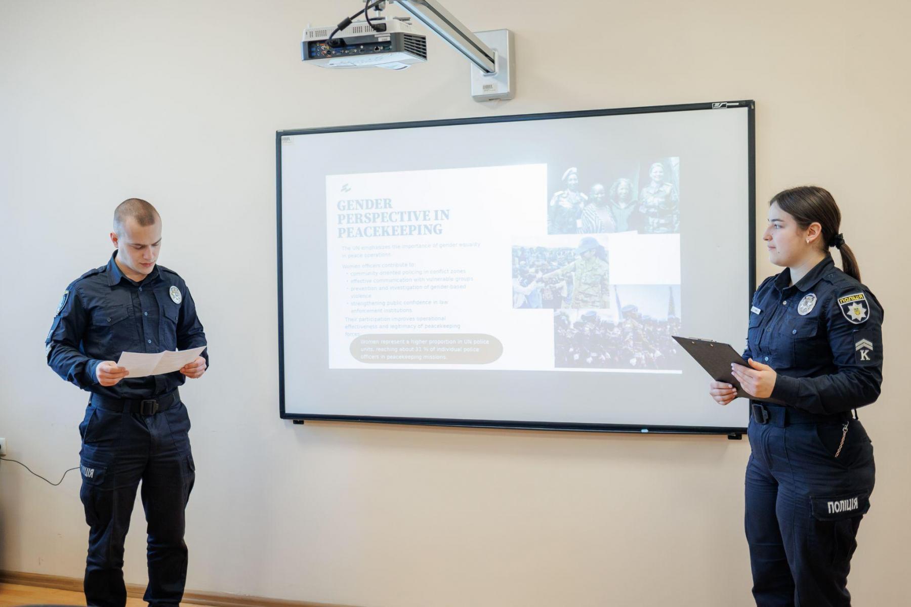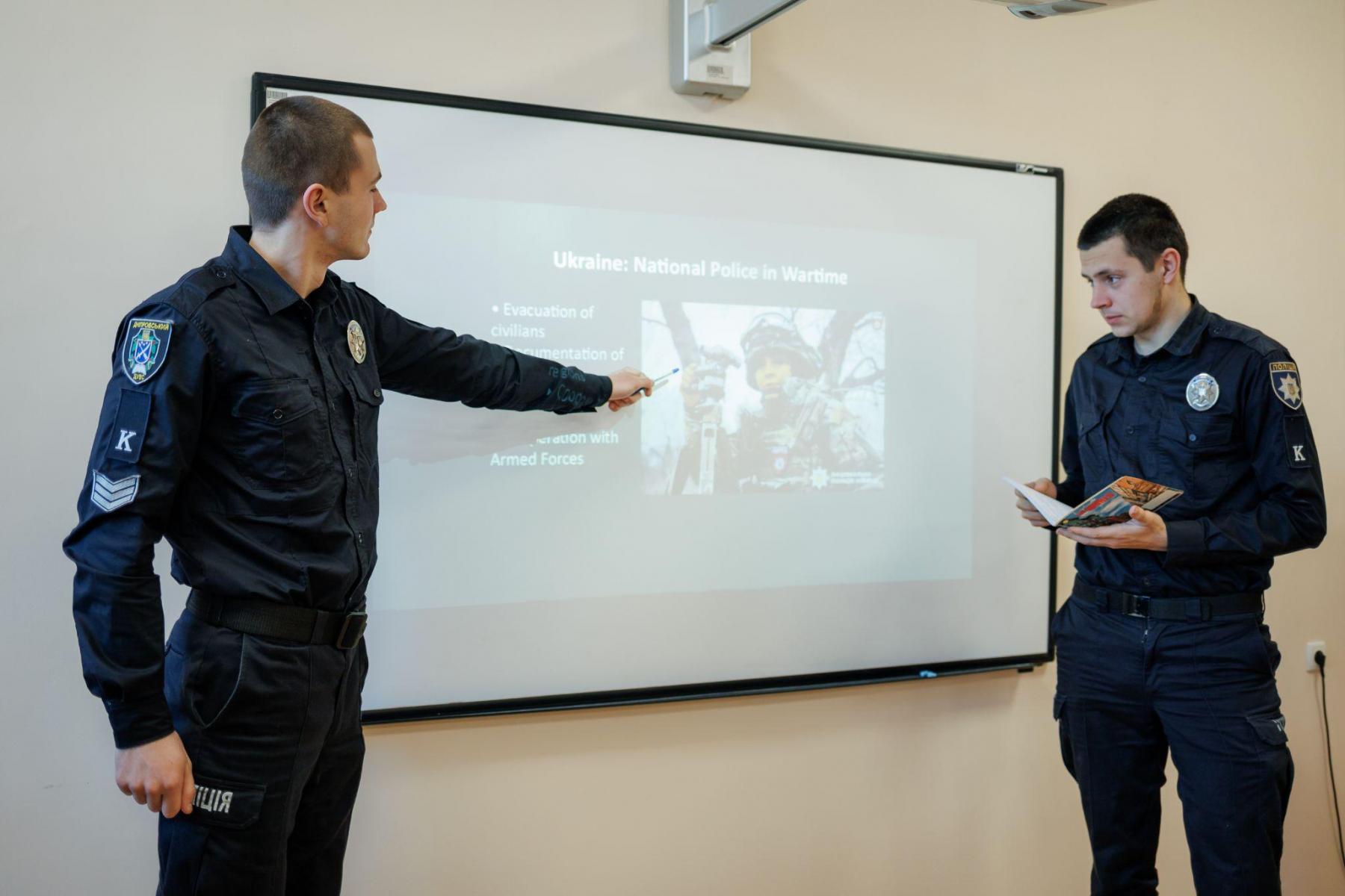 Курсанти підготували презентації про діяльність жінок, які працюють поліцейськими, слідчими та детективами в різних країнах світу. Під час круглого столу здобувачі захищали свої проєкти англійською мовою.