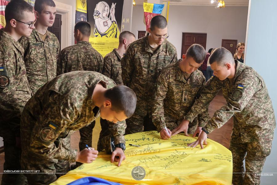А днями для майбутніх офіцерів була організована екскурсія на унікальну виставку «Народжені війною», яка об’єднала понад 50 прапорів — символів боротьби, стійкості та незламного духу українців, на яких зображені імена, позивні та історії героїв, що боронять Україну з 2014 року. Важливою частиною заходу став збір підписів на рекордному Державному Прапорі України (15 × 5,5 м) на підтримку безвісти зниклих, до якого долучилися й курсанти інституту, залишивши власні підписи як символ єдності та вдячності. Також курсанти взяли участь у майстер-класі «Намалюй свій шеврон», де проявили креативність і відповідальність, створюючи ескізи, що невдовзі будуть доопрацьовані дизайнерами та передані їм як пам’ять про подію, яка стала важливим кроком у вихованні патріотизму та поваги до державних символів серед майбутніх офіцерів.