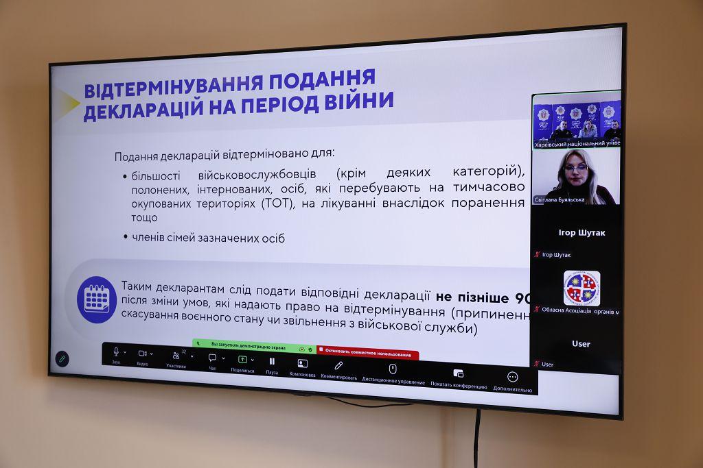 Експерткою зустрічі стала уповноважена з антикорупційної діяльності ХНУВС Катерина Удод. Вона роз’яснила ключові правила декларування під час воєнного стану, зокрема питання відтермінування подання декларацій, вилучення відомостей із реєстру, а також особливості підготовки та заповнення декларацій. Окрему увагу приділила новим можливостям Єдиного державного реєстру декларацій, ресурсам НАЗК і типовим помилкам під час заповнення розділів декларації. Також було розглянуто особливості декларування для військовослужбовців і членів їхніх сімей.