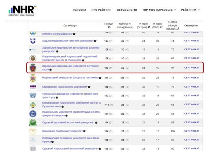 Харківський національний університет внутрішніх справ, маючи показник National H-index – 30, посів 110 місце та залишається єдиним серед ЗВО МВС, що готують поліцейських, який входить до категорії «Високий науковий потенціал».