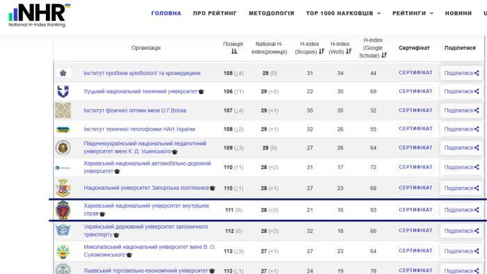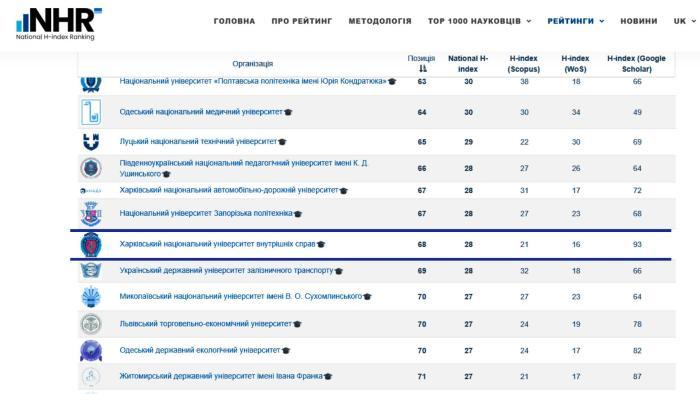 Ukrainian National H-Index Ranking також склав Рейтинг ЗВО України відповідно до показника National H-index 2025, поточна версія якого оцінювала показники 232 ЗВО. ХНУВС посів 68 позицію.6.jpg)