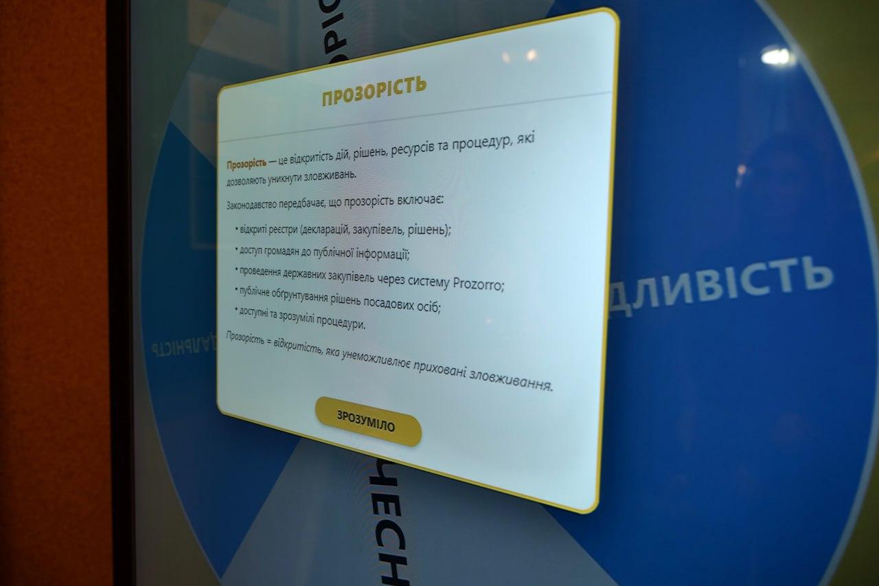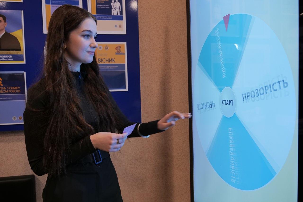 Під час інтерактивного блоку студенти та студентки працювали з «Колесом антикорупції» – цифровою панеллю, що у форматі випадкового вибору пояснювала значення та практичне застосування таких цінностей, як чесність, прозорість, відповідальність та справедливість.
