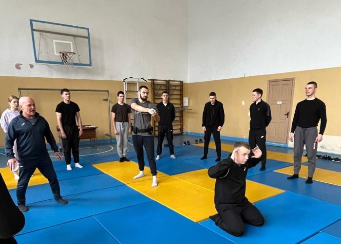 Під час бінарного заняття з дисципліни «Спеціальна фізична підготовка» особлива увага була приділена техніці захисту від ударів ножем, обеззброєнню та затриманню злочинця.