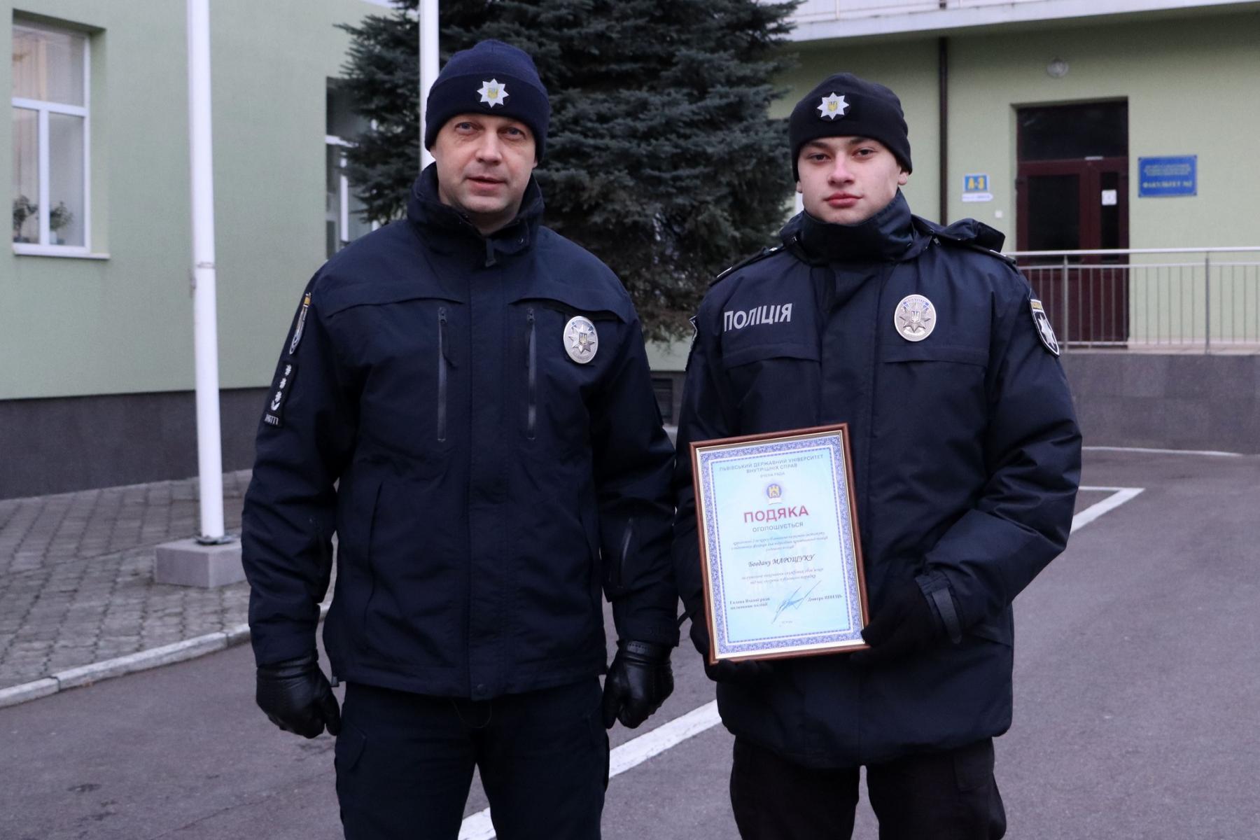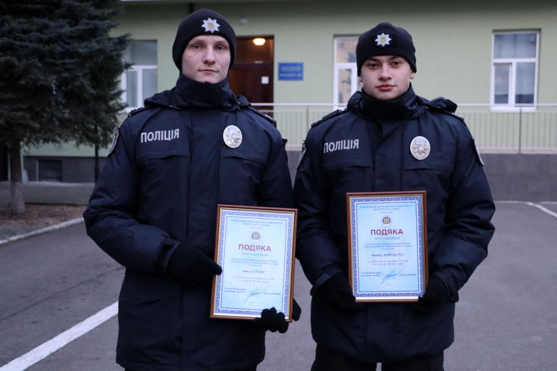 Відзнаки отримали другокурсники Навчально-наукового інституту з підготовки фахівців для підрозділів кримінальної поліції Богдан Марощук та Іван Голуб.