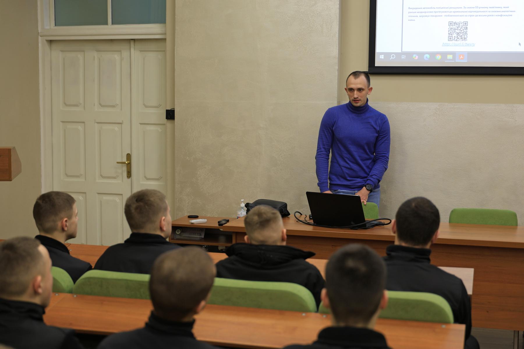 Фахівець розповів курсантам вишу про становлення, структуру та завдання цього підрозділу, а також приділив увагу практичним аспектам діяльності кримінальних аналітиків в умовах воєнного стану.