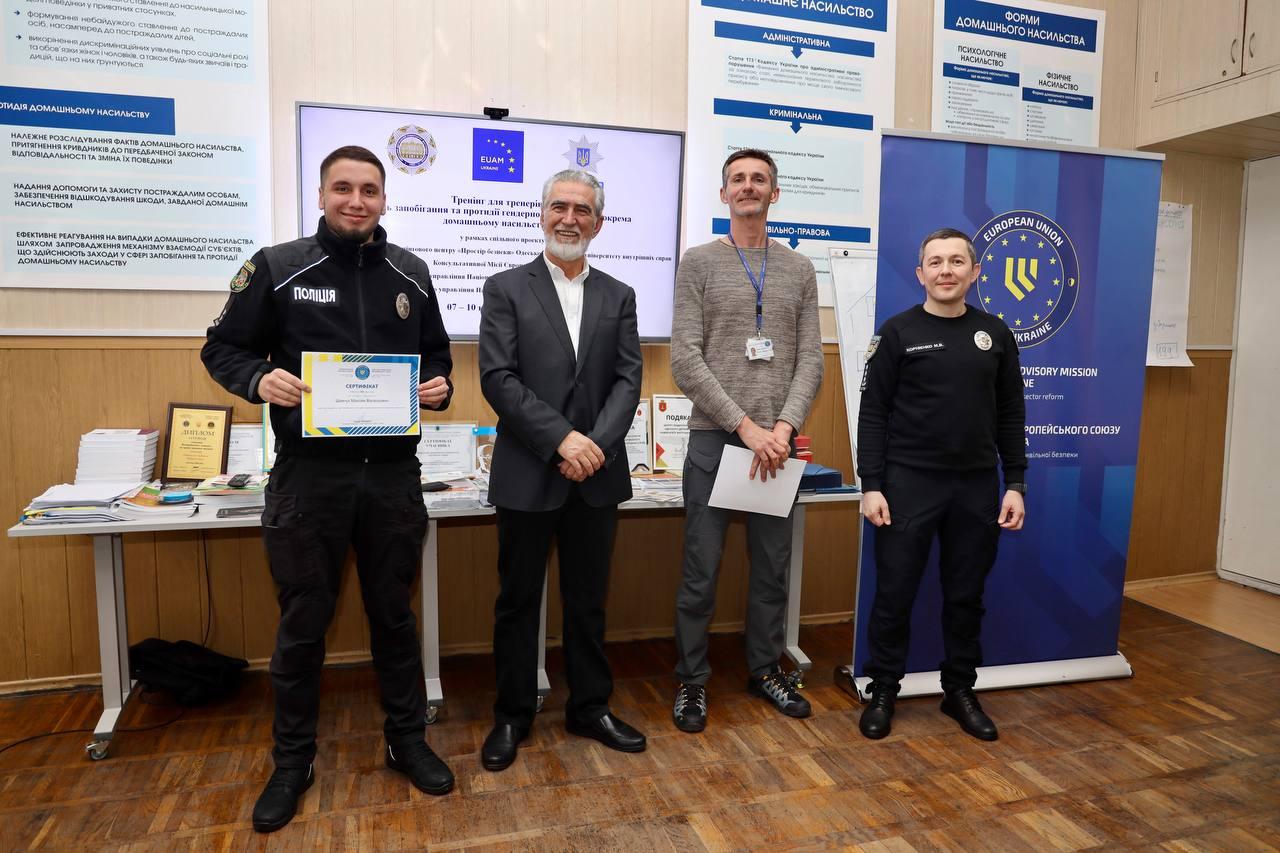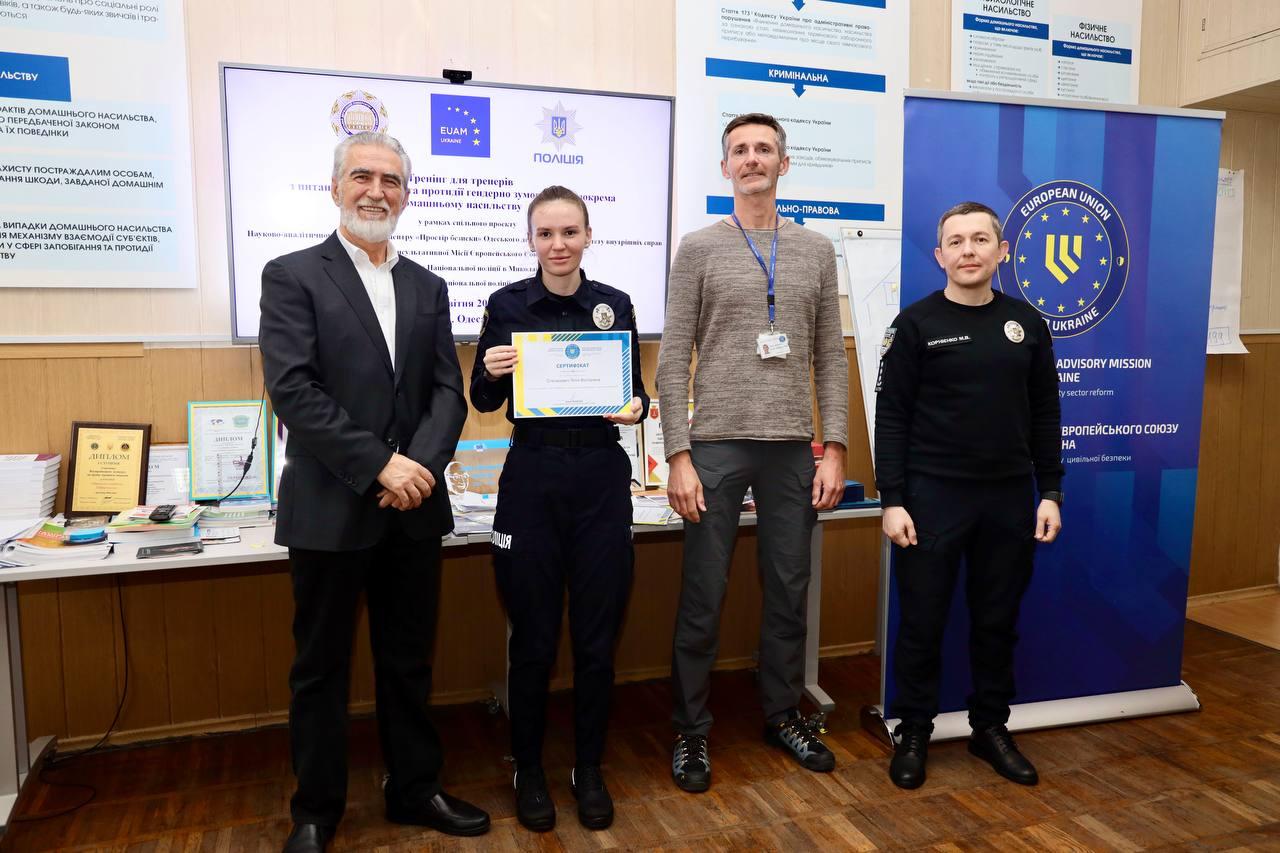 За результатами тренінгу 16 учасників та учасниць отримали сертифікати тренерів, які вручив т.в.о. першого проректора ОДУВС доктор юридичних наук полковник поліції Максим Корнієнко та представники Консультативної місії Європейського Союзу Георгіос Покас та Ян Данчо.