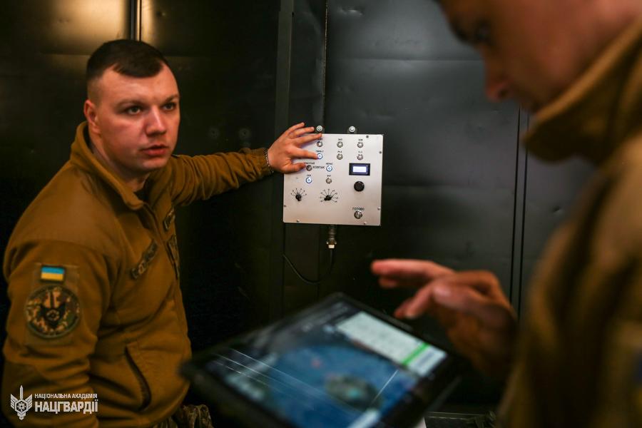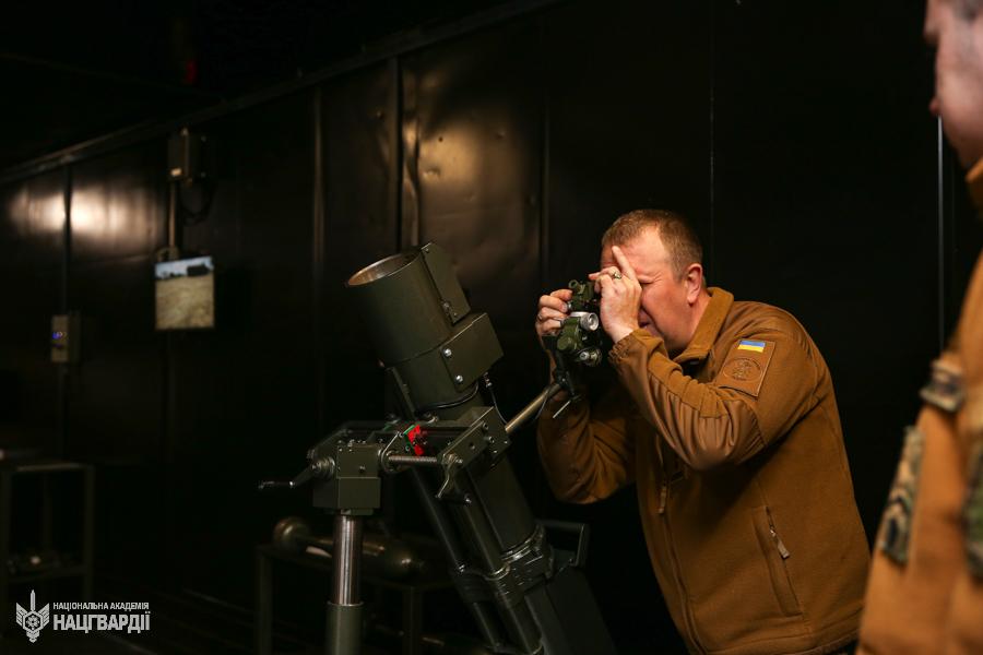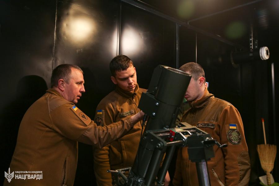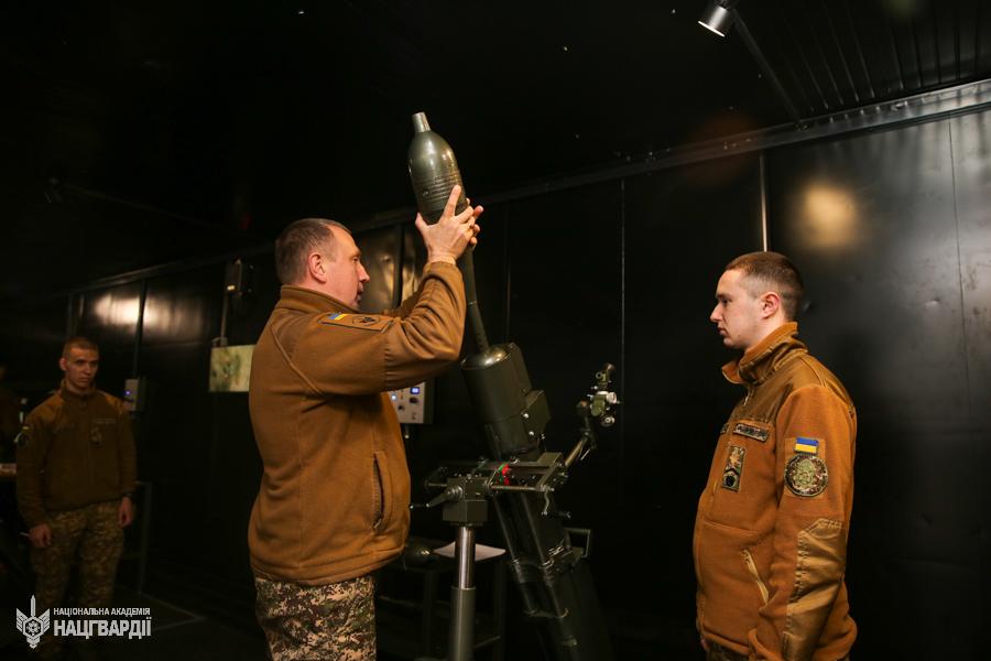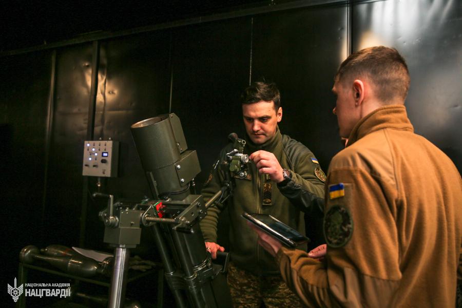 Курсанти Національної академії Національної гвардії України відпрацьовують практичні дії номерів обслуг на тренажері 120-мм та 82-мм мінометів контейнерного типу. Це сучасний навчальний комплекс, призначений для підготовки бійців артилерійських підрозділів із використанням макетів мінометів відповідних калібрів.