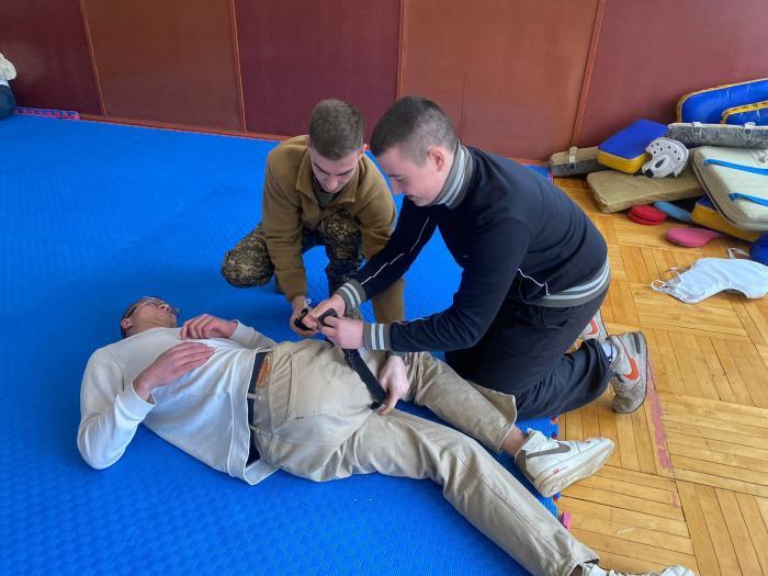 Представники кафедри тактико-спеціальної підготовки ХНУВС старший викладач Валерій Швець і провідний фахівець Олексій Міхно ознайомили старшокласників Агрономічного ліцею зі способами надання домедичної допомоги, продемонстрували засоби зупинки масивної кровотечі та навчили застосовувати турнікети на різні види кінцівок.