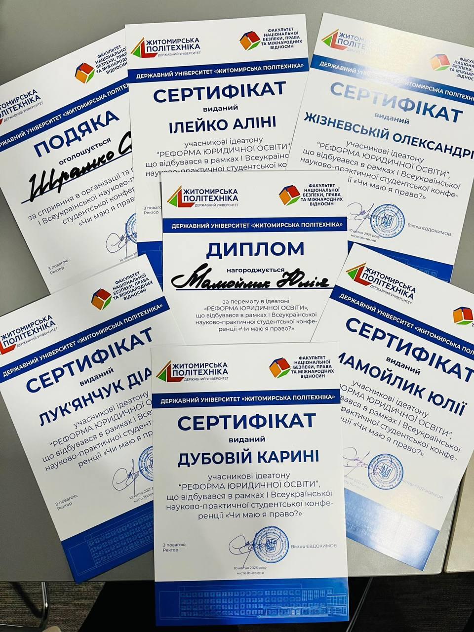 Юлія Мамойлик, студентка 3-го курсу спеціальності «Право» навчально-наукового інституту права та психології Національної академії внутрішніх справ, здобула перемогу в студентському ідеатоні «Реформа юридичної освіти». Захід відбувся в межах Всеукраїнської науково-практичної студентської конференції «Чи маю я право?», організованої Державним університетом «Житомирська політехніка».