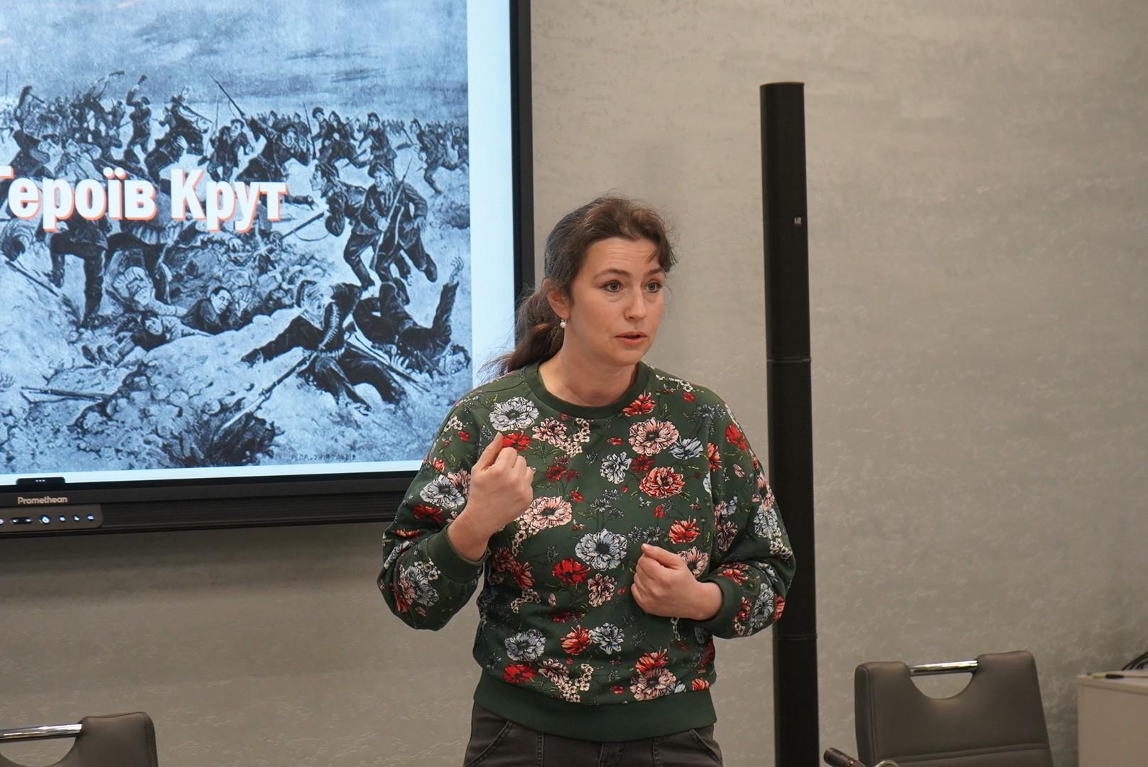 Вона розповіла про історичні передумови події, участь молоді у захисті української державності та результат бою – це стримало наступ багатотисячної більшовицької армії та дозволило Українській Народній Республіці виграти час і підписати Берестейський мир, здобувши визнання незалежності.