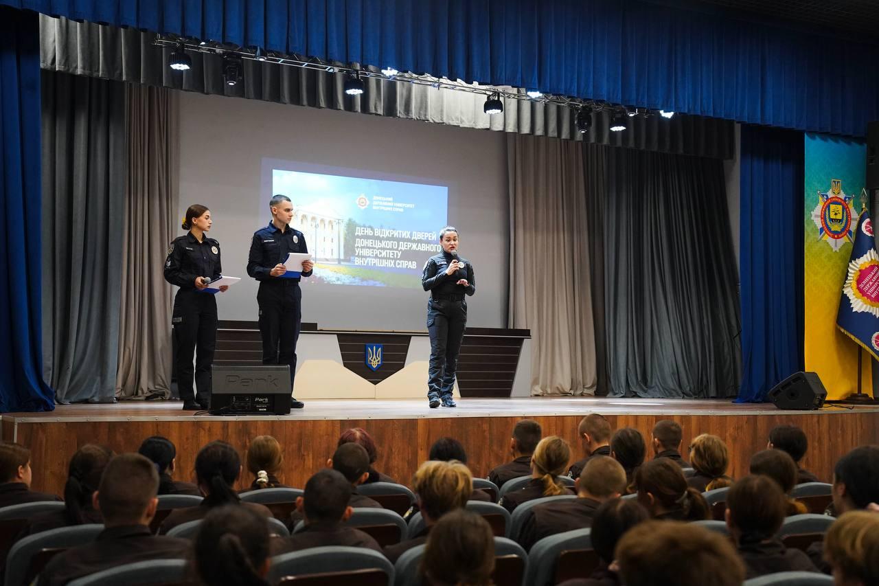 У межах презентації освітніх напрямів старшокласники дізналися про перелік спеціальностей, за якими здійснюється підготовка у ДонДУВС як за державним замовленням, так і за кошти фізичних та/або юридичних осіб: «Право», «Правоохоронна діяльність», «Публічне управління та адміністрування», «Економіка» та «Психологія».
