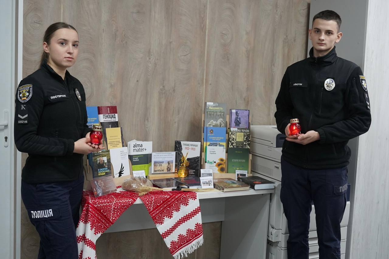 У загальный бібліотеці ДонДУВС представили виставку-інсталяцію «Пам’ять, що не згасає», до якої увійшли документальні матеріали та символічні атрибути — житній хліб, колоски та вишитий рушник.