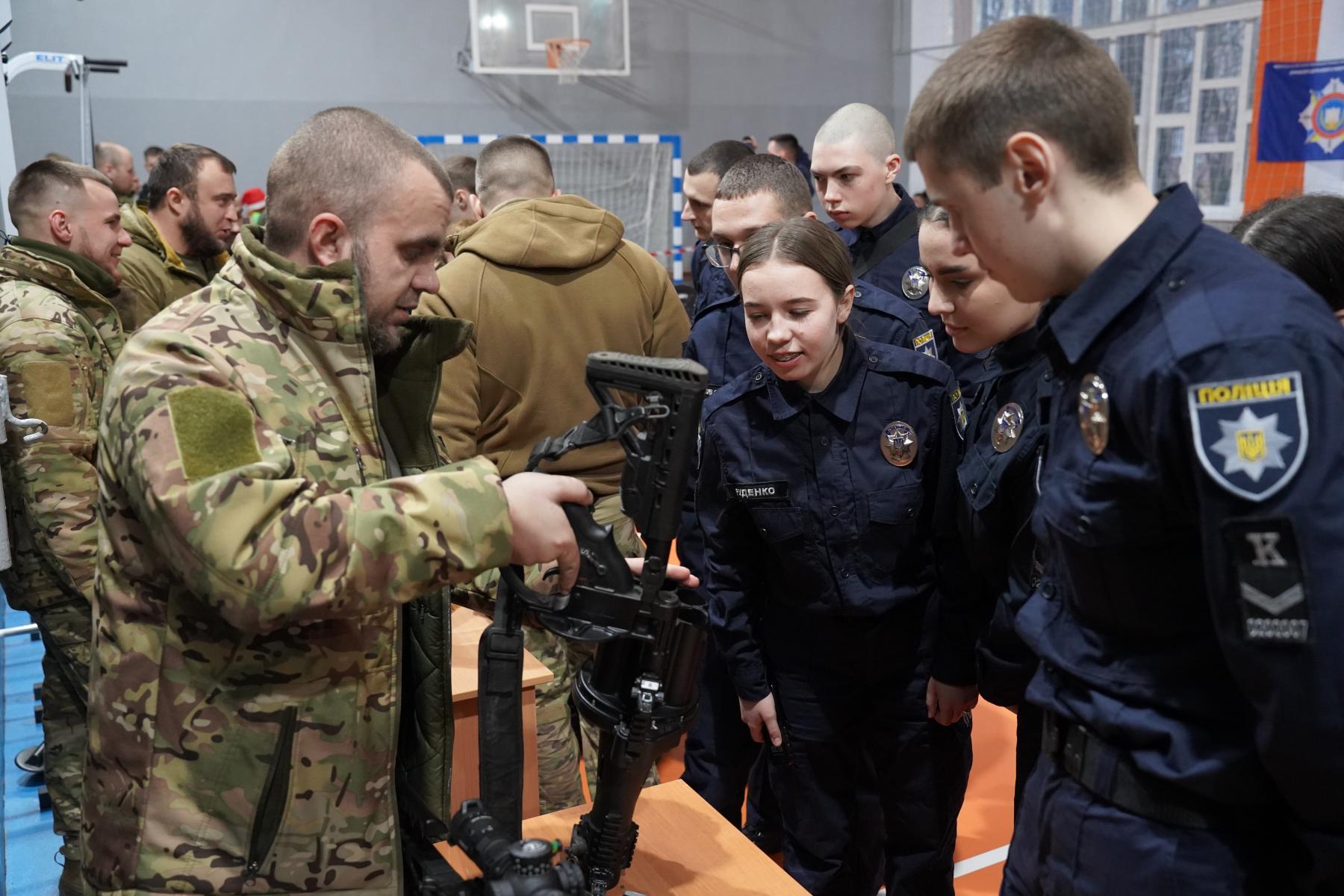 У свою чергу бійці батальйону спеціальних операцій «Еней» організували для здобувачів вищої освіти виставку сучасної стрілецької зброї та розповіли про її можливості й порядок застосування.