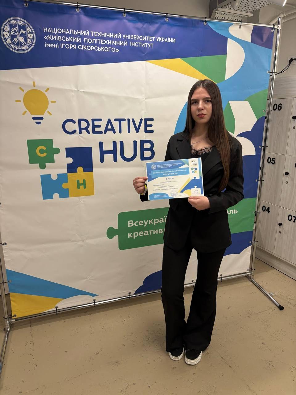 Творча молодь також відзначилася на Всеукраїнському фестивалі креативної молоді «CreativeHub 2026», організованому Національним технічним університетом України «КПІ ім. Ігоря Сікорського». Наші учасниці посіли призові місця: І місце — Діана Ткаченко (у номінації «Соціальна реклама»); ІІ місце — Владислава Шевченко (у номінації «Стоп діпфейк»). Окремо слід відзначити Діану Ткаченко, яка за свою перемогу отримала цінний приз від партнера конкурсу — маршрутизатор Huawei.