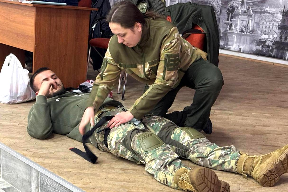 Старший викладач кафедри тактико-спеціальної підготовки факультету №2 ЛьвДУВС Богдан Білінський спільно з інструкторкою 125-ї окремої бригади територіальної оборони ЗСУ Іриною Васечко продемонстрували курсантам, як правильно накладати турнікет у разі масивної кровотечі.