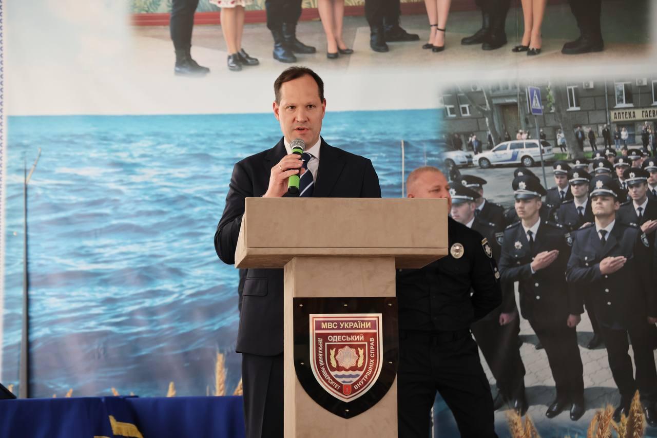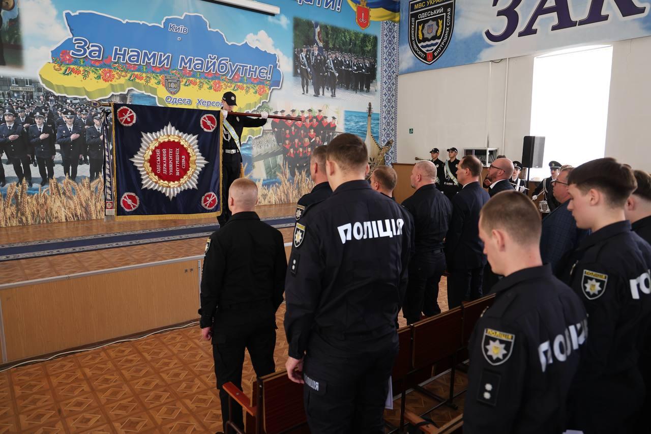 Дипломи про вищу освіту випускникам вручили почесні гості, серед яких директор Департаменту юридичного забезпечення МВС України Денис Горбась - він привітав випускників від імені колегії Міністерства внутрішніх справ України. Також участь у заході взяли заступник Голови Національної поліції України генерал поліції третього рангу Андрій Нєбитов, народний депутат України, голова Наглядової ради ОДУВС Олексій Леонов та начальник ГУНП в Одеській області генерал поліції третього рангу Іван Жук.