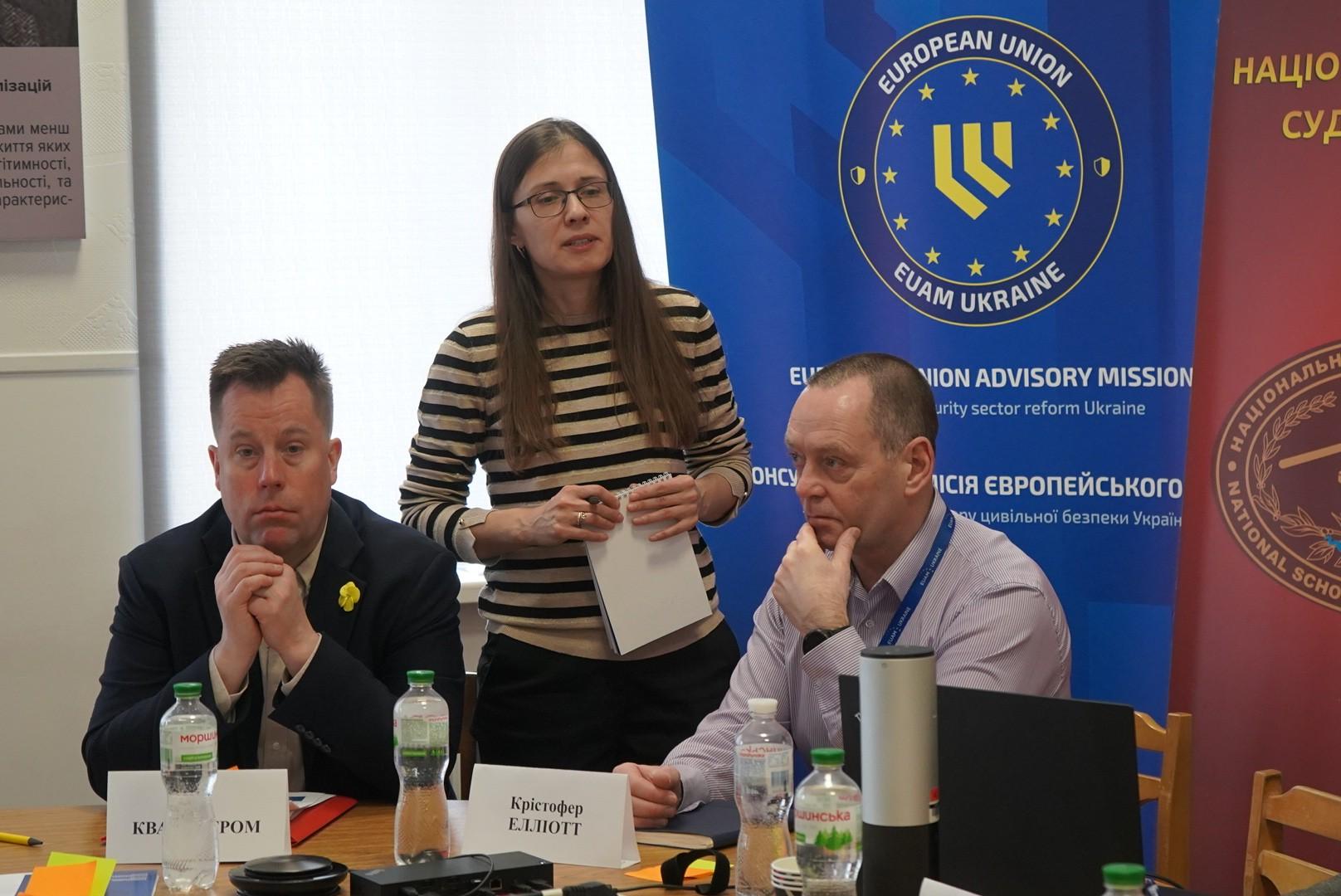 Від КМЄС виступили: керівник мобільного підрозділу Йохан Сітріус, радник з питань кримінального розслідування у справах про організовану злочинність Крістофер Елліот, старший радник з питань прав потерпілих Ола Кварнстром, старший радник з питань кримінального переслідування у справах про міжнародні злочини Даріуш Сіеліцкі, спеціаліст з питань реформи прокуратури Наталія Монич.
