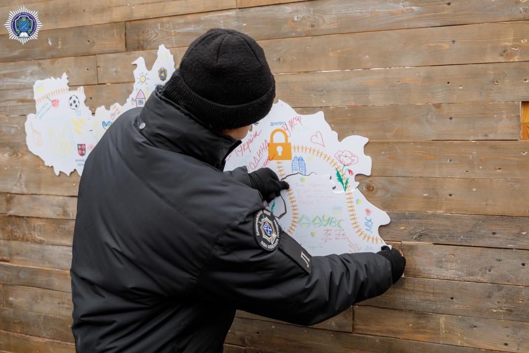 Коли всі елементи пазлу було складено, утворилася загальна картина із зображенням ланцюга, що проходив через кожен регіон, символізуючи їхній нерозривний зв’язок. У центрі, на частині, що символізувала Дніпропетровську область, було зображено замок як символ того, що Дніпро єднає всю Україну.