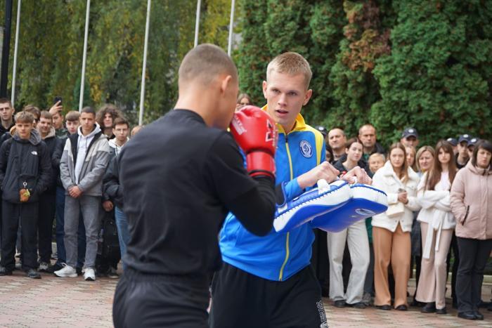 Члени збірної команди ХНУВС із тайландського боксу та французького боксу «САВАТ», які є недноразовими чемпіонами України з цих видів спорту, продемонстрували ударний елемент тренування, а саме відпрацювання ударної техніки руками, ногами та колінами, з боротьби самбо – виконання нормативів із захисту від холодної та вогнепальної зброї.1.jpg)